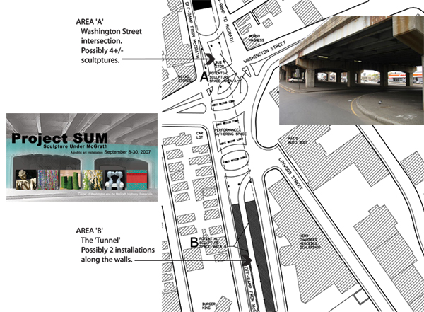 The area under the overpass had previously been used for a one night dance party starting the process of re-visioning an unpleasant space. One night was exposing the change to a small group where we wanted to have an installation in place for a longer time period for more people to consider. Additionally, there are many sculptors that do larger projects but don’t necessarily have a venue to display them. We received multiple submittals and the jury selected 10 artists to install their work. The response was overwhelmingly positive. There were interactive pieces and other pieces that we there for display. The installation was in place for a month. We also prepared a conceptual master plan for the redevelopment of that area for a long term outdoor gathering space for markets, concerts, etc. and presented it to the city as well as a few independent groups. Since the area was under an overpass, it made for an ideal space for venues since it was somewhat protected from the elements. The overall idea was embraced but the time, money, and energy wasn’t available at that time.